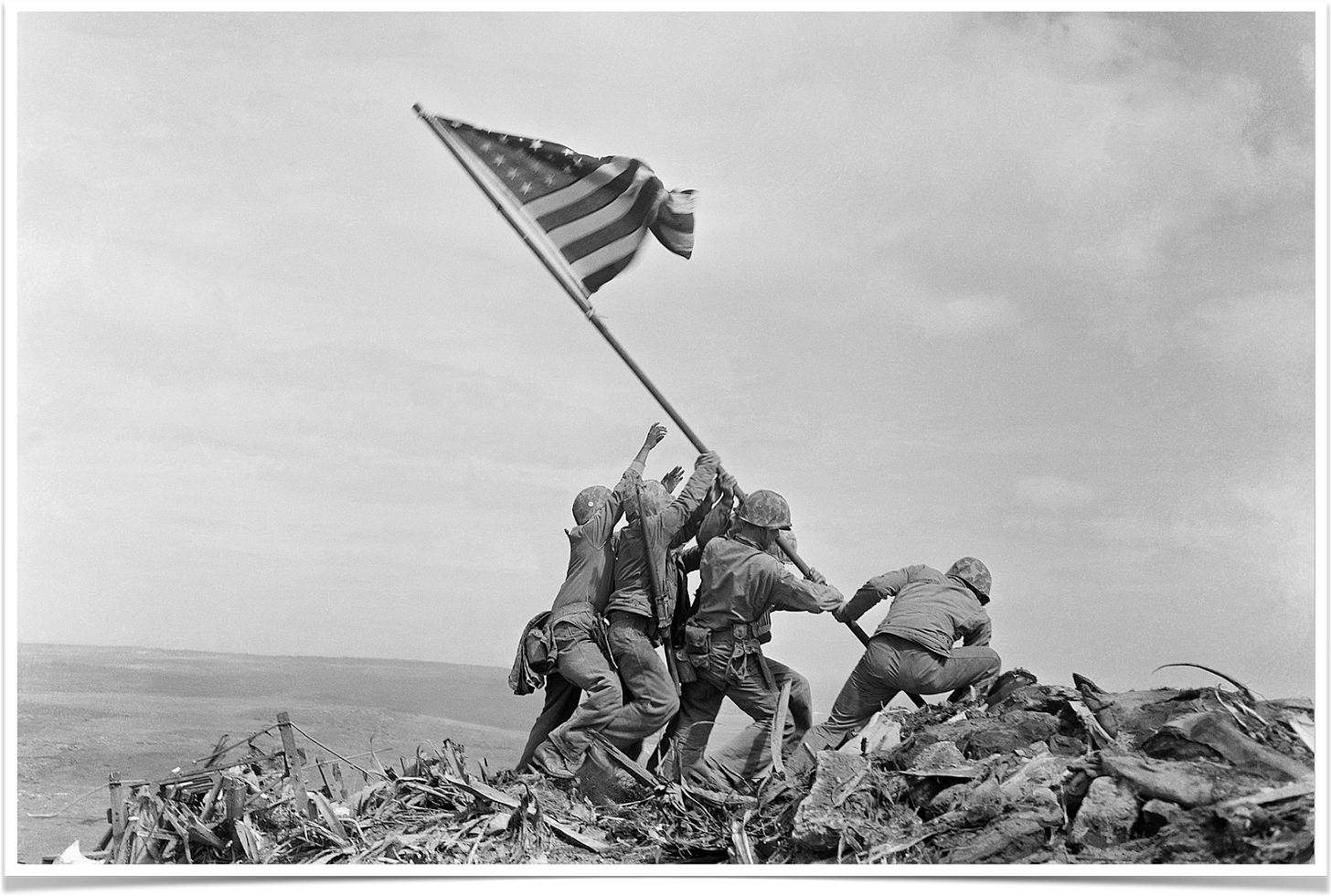 "Marines raised a United States flag atop Mount Suribachi to mark the capture of the most strategic point on the island." I can hear and feel the cheers!