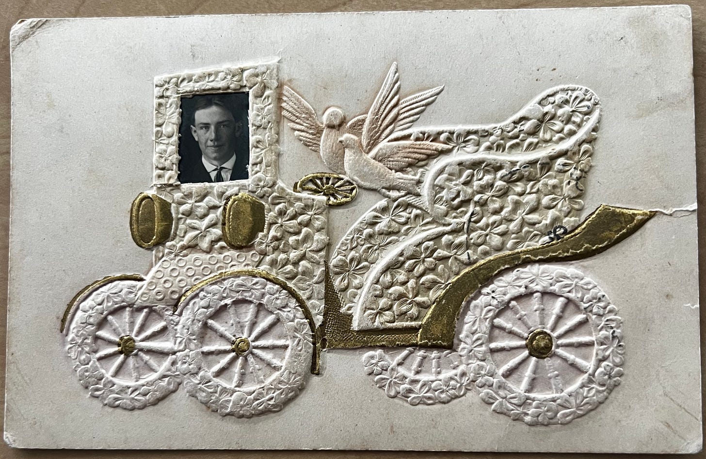 To me, the design of the postcard looks matrimonial. Doves. Gold accents. Flowers. I mean, right? Robert wed Alice Devine in November of 1910. In my imagination, it’s possible that this postcard was a clue, signaling to his sister an impending engagement! That said, this would have been about 18 months prior to their actual wedding date. Maybe Robert had asked for permission to marry Alice but was denied and that led to some delays? It turns out that Robert and Alice, knowing their parents would never agree for them to marry due to their differing faiths and ethnicities, ran away to be married!