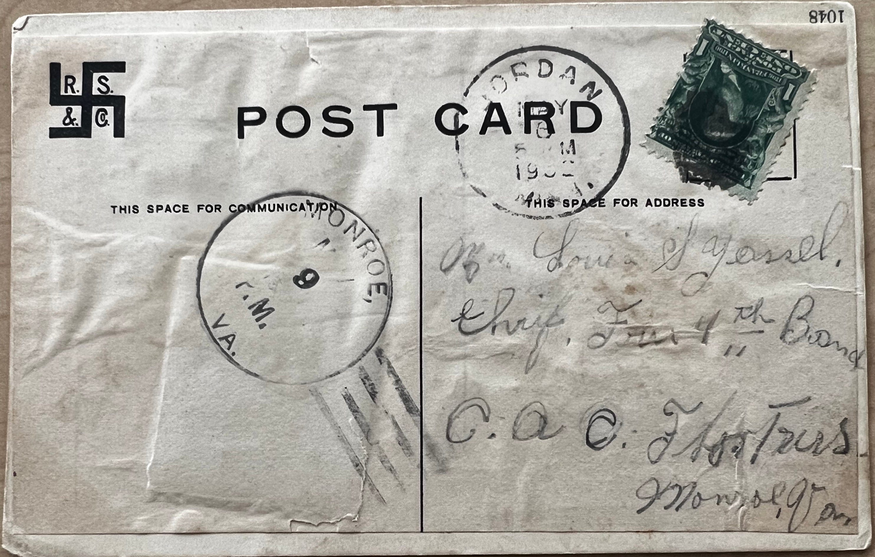 Of note, the 1¢ green Benjamin Franklin stamp is positioned on the postcard in a manner that has a special meaning. In this case, it means “With all my heart” or “Have you forgotten me” — either of which is a tender sentiment from a brother to his sister.